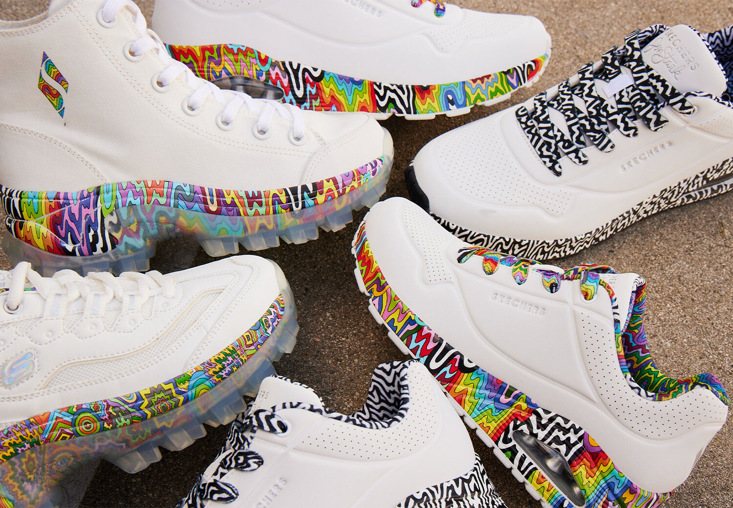 Desenhado hipnoticamente e opticamente cativante, o universo de Jen Stark é um caleidoscópio de brincadeiras constantes. Suas vibrantes ilusões abstratas decoraram numerosos murais e enfeitaram as paredes de museus e galerias renomados em todo o mundo, transcendendo a recém-lançada coleção Skechers x Jen Stark.